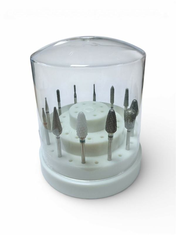 Zit in een handige frezenhouder waar 48 freesjes in opgeborgd kunnen worden.